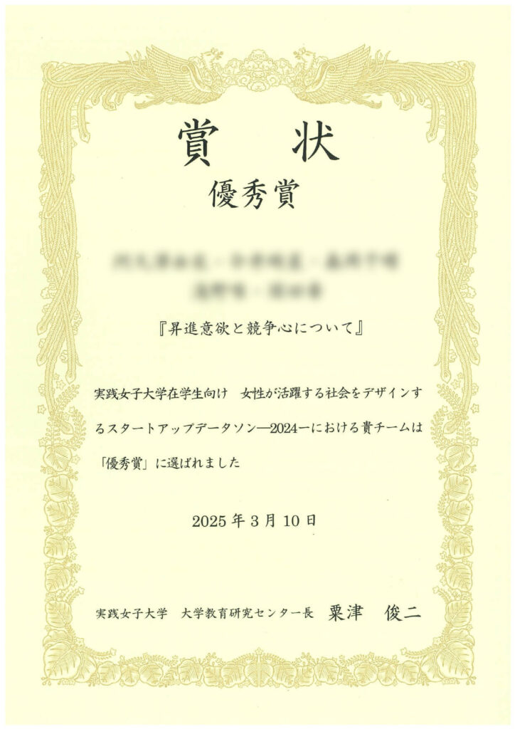 カテゴリ 全ての記事 活動報告・ご案内 アルバム・研究室だより 主な講演・出張授業など 動画紹介 その他 2024.03.10 スタートアップデーターソン 実践女子大学在学生向け 女性が活躍する社会をデザインするスタートアップデータソン-2024-にてゼミ生たちの発表が「優秀賞」に選ばれました。 カテゴリ記事一覧へ お知らせトップへ